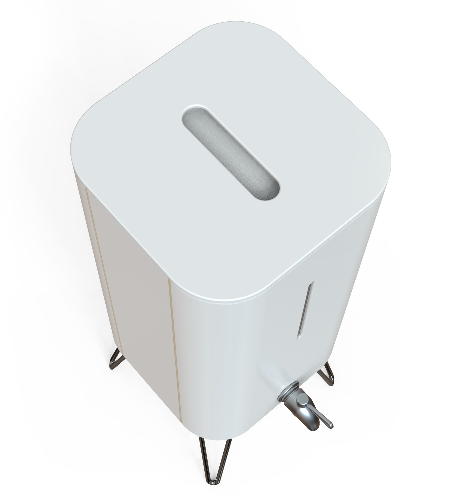 This limited production run water filter was manufactured out of thermoformed Corian and using Berkey charcoal with fluoride canister filters. The upper unfiltered water reservoir is separated from the lower filtered area by a rubber gasket and plate system secured by easily accessible stainless steel thumb screws.